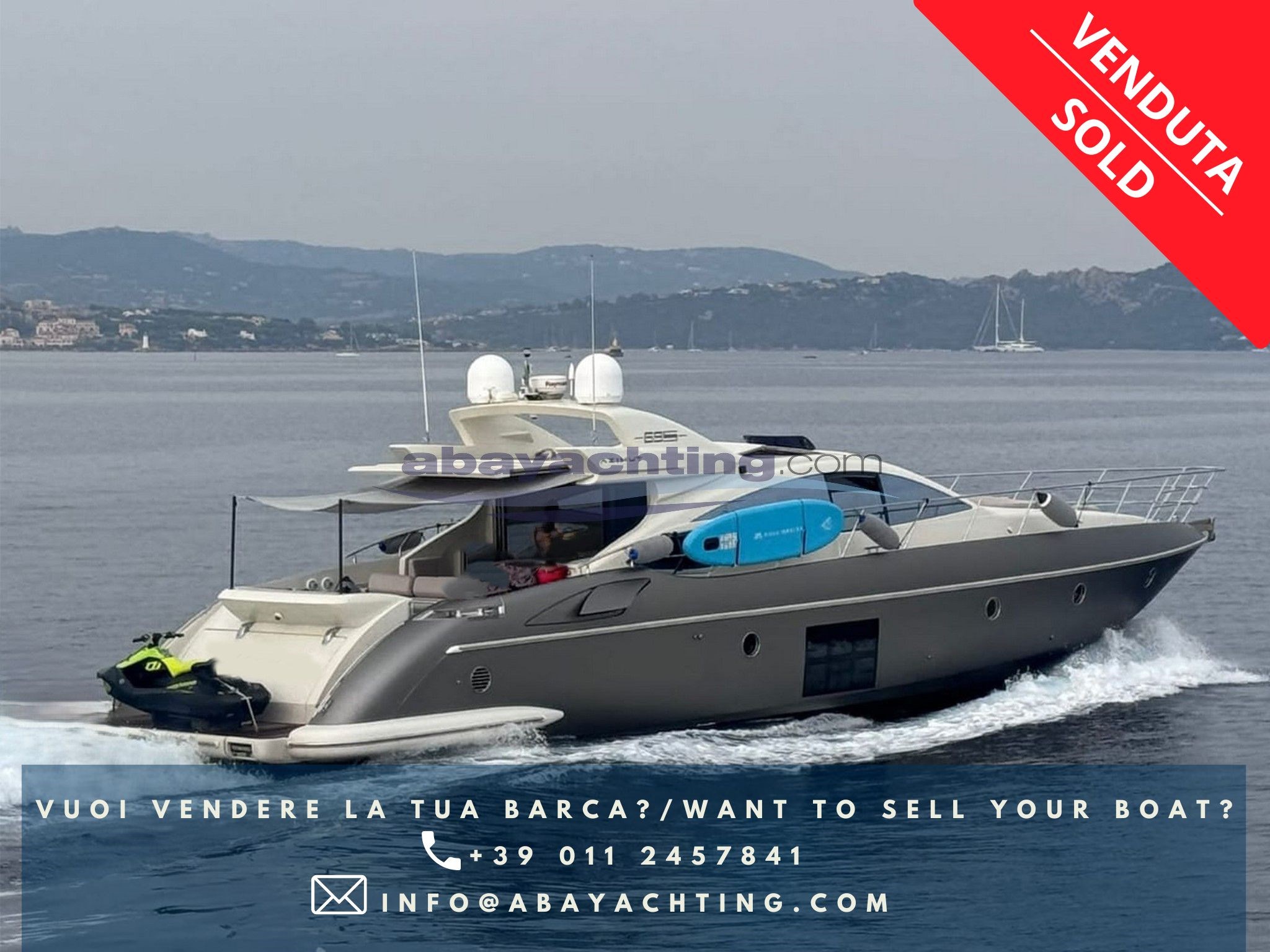 Beautiful version of Azimut 68s with grey hull and 3-cabin, 3-bathroom + crew cabin layout. Engines with constant maintenance. Teak on the stern platform refitted in 2021. Deck teak replaced in 2017; Stern platform tender lift; Full optional boat: 20 kw generator, stern thruster + bow thruster, garage for the tender, air conditioning (hot/cold), satellite TV antenna, new 2024 outdoor cushions, electric awning for total coverage of the cockpit, new 2024 cockpit seats, new cockpit table and Raymarine electronics with 2 new Axiom 12’ plotters. Used Azimut 68S. The data in this sheet are not to be considered contractual.
